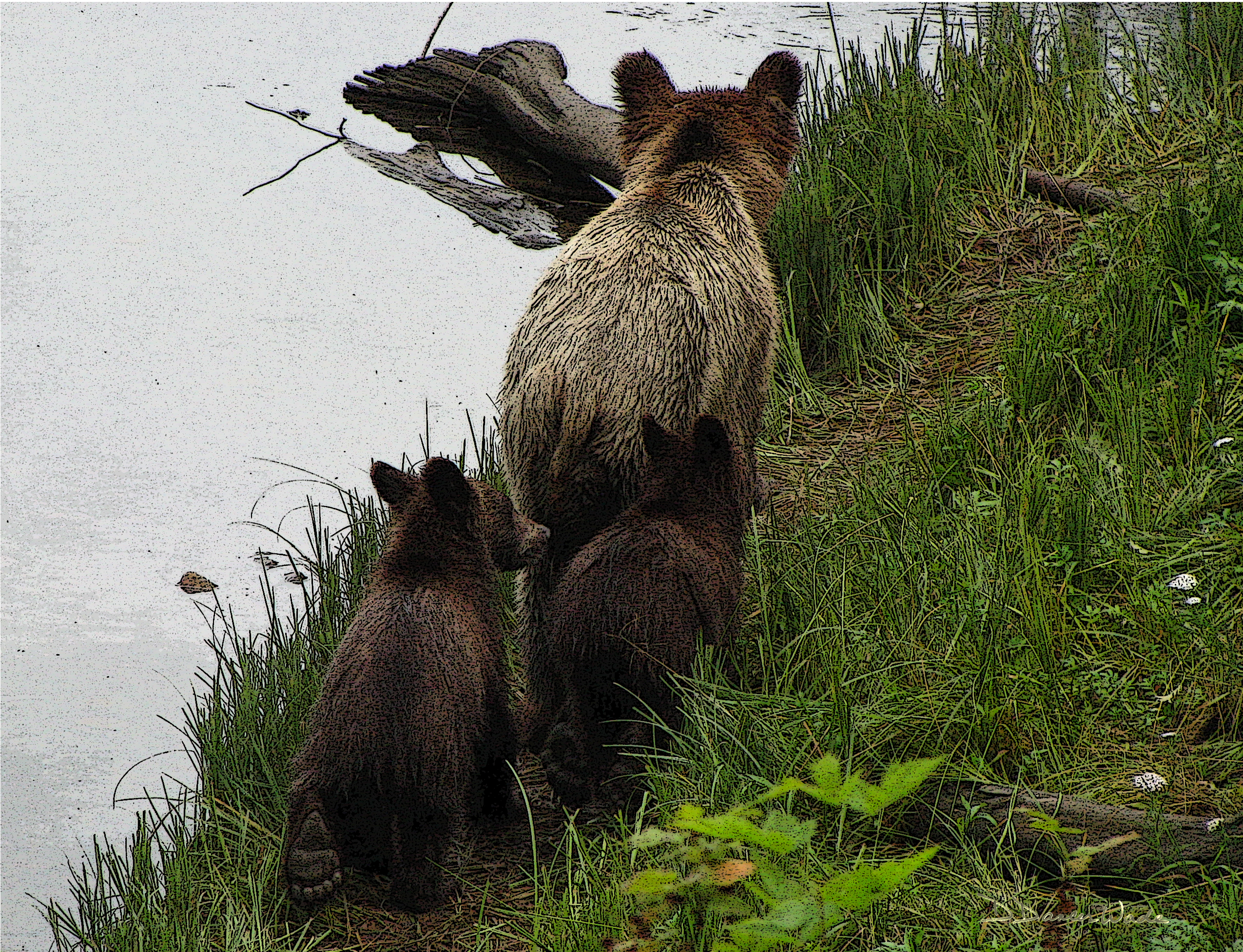 At first the young family stays close to the winter den until the cubs learn to scramble over logs, along steep rocky slopes and through the dense underbrush. Slowly, she leads her cubs down to the low tide beaches of Knight Inlet. It is on these rocky beaches she will find protein, that will provide the calories required to replace the almost forty percent of her body weight she lost over the winter. She will teach her young charges how to roll rocks to find tasty morsels of eels, crabs and small fish that have been stranded under the rocks as the water recedes. By the middle of summer these cubs of the year will be rolling rocks that are half their size just like mom.